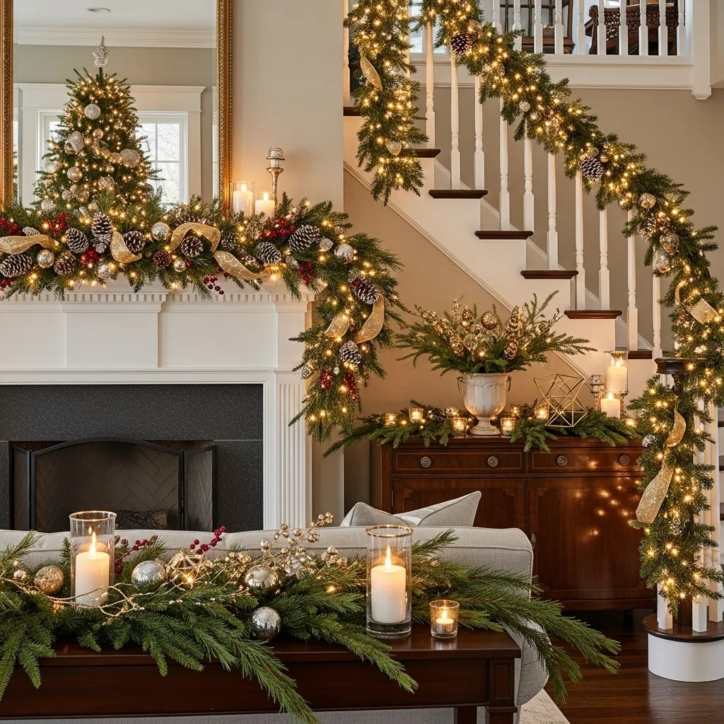 Styling Tip: For a balanced look, mix a traditional garland with modern metallic accents like gold or silver pinecones and ornaments. Pair this with white or soft yellow lighting to create a warm, inviting atmosphere throughout your living room.