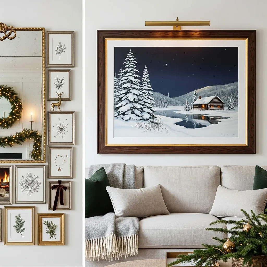 Styling Tip: Keep wall decor simple and understated to maintain elegance. Hang artwork above the sofa or on a feature wall, and try using a few smaller pieces grouped together for visual interest. Use frames with metallic accents to complement your holiday theme.