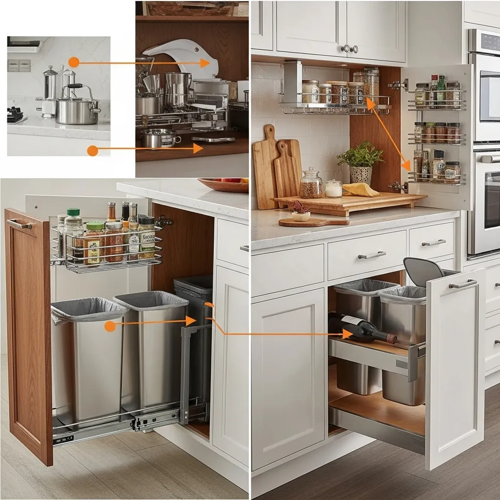 Why It Works: Corner extensions help eliminate dead space in your kitchen and provide much-needed storage for bulky or rarely used items. Using specialized pull-out or rotating mechanisms ensures that these items are easy to access, making your kitchen more functional.