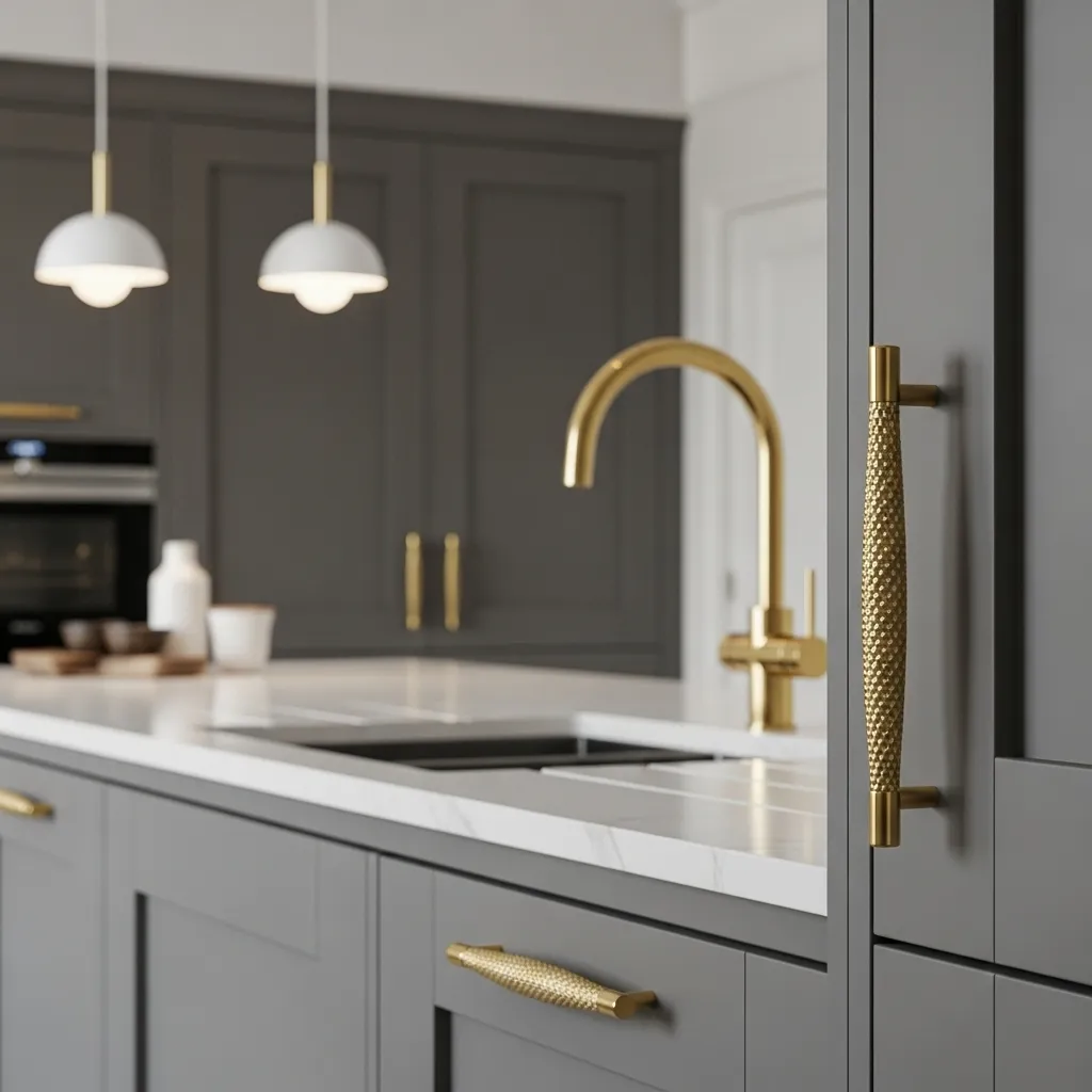 Why It Works: Gold adds a warm, opulent contrast to the cool tones of grey. This pairing can elevate your kitchen from simple to high-end, adding refinement without overwhelming the design. Gold hardware also pairs beautifully with matte, satin, or glossy grey finishes.