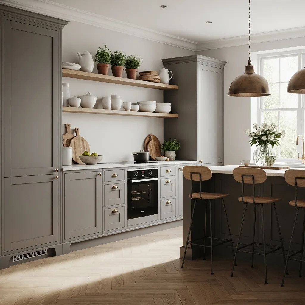 Design Tip: Grey open shelving creates an elegant yet functional storage solution for your kitchen. Whether used for displaying cookware, glassware, or decorative items, open shelves offer a practical and stylish way to organize your kitchen. The grey color adds a contemporary touch while keeping the space looking open and airy.