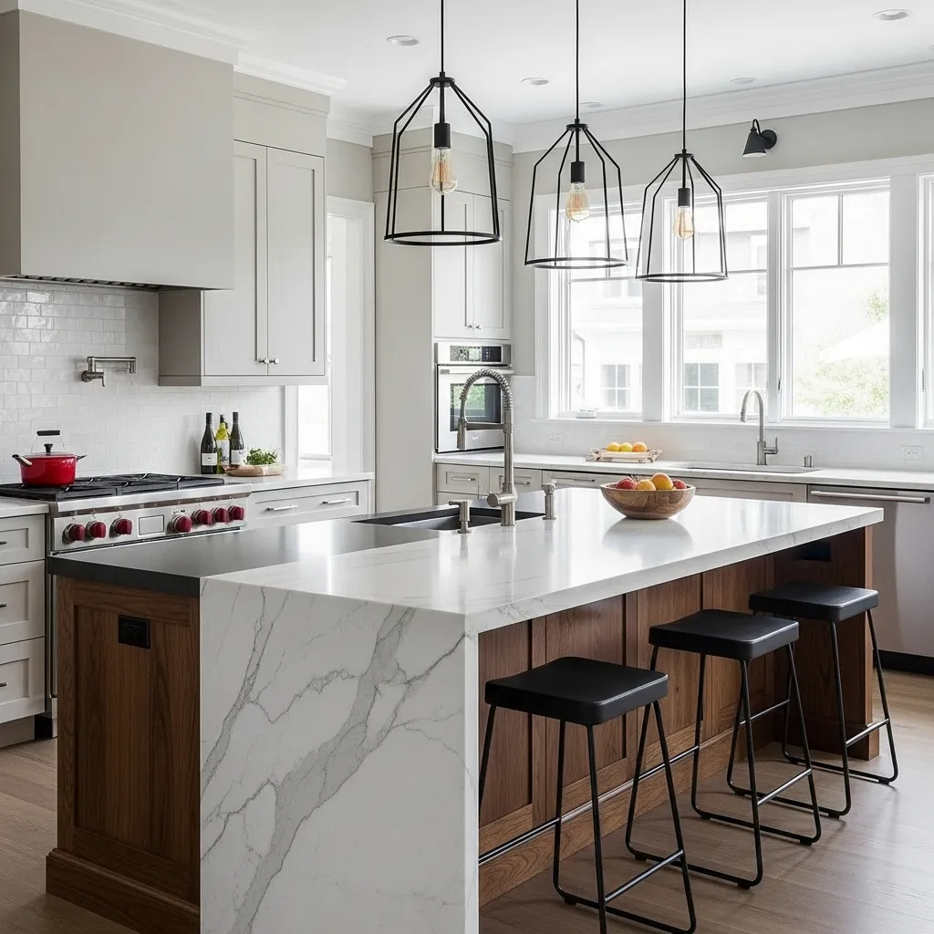 Styling Tip: Choose materials like marble, granite, or wood for the island to contrast with the rest of the kitchen. For extra flair, add pendant lighting above the island to draw attention to this focal point, and make sure the island’s design complements your kitchen’s overall aesthetic.