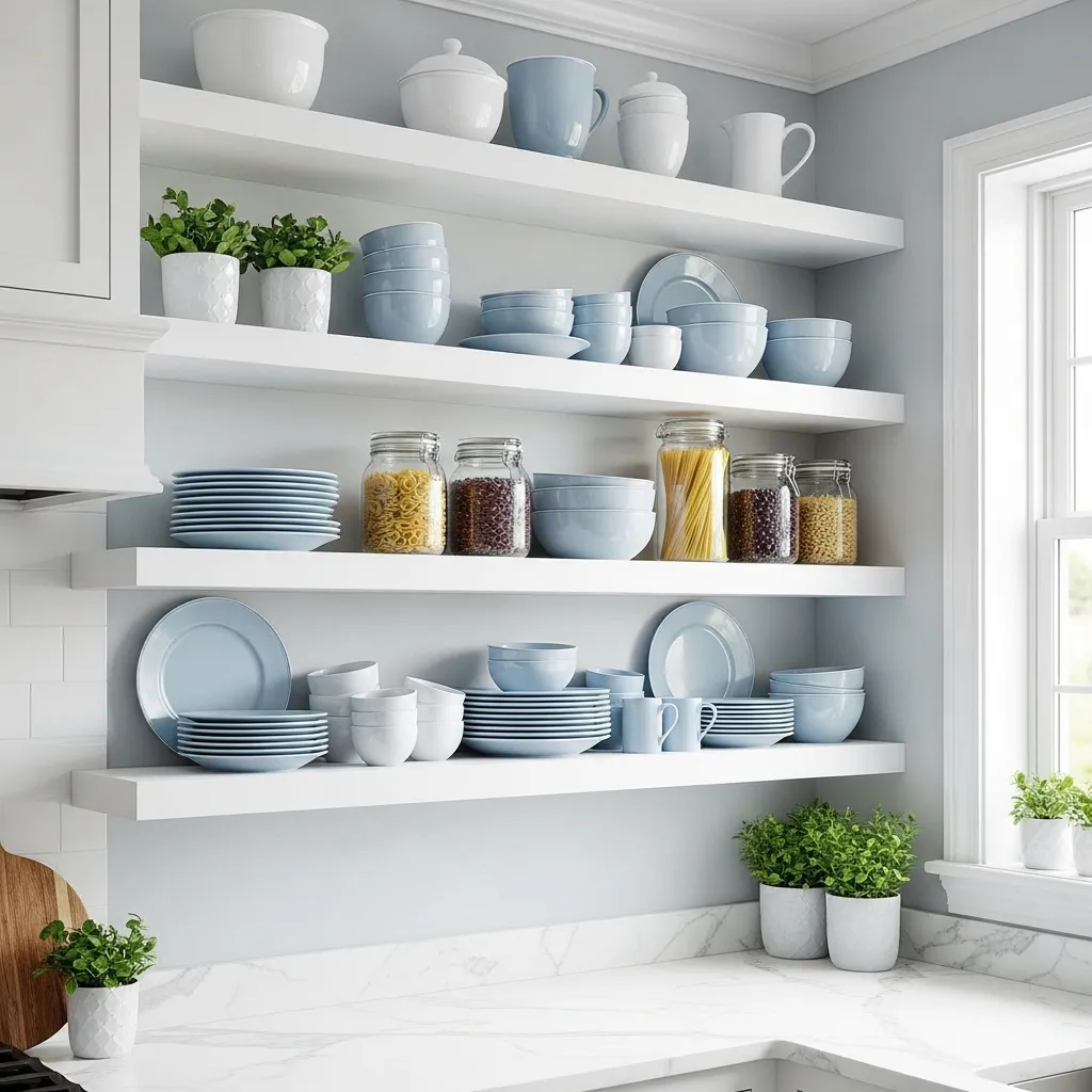 Styling Tip: Keep the shelves neat and well-organized to avoid a cluttered look. Use matching containers for dry goods and group similar items together. Adding plants or small decorative items can also bring life to your shelves while maintaining an elegant, simple vibe.