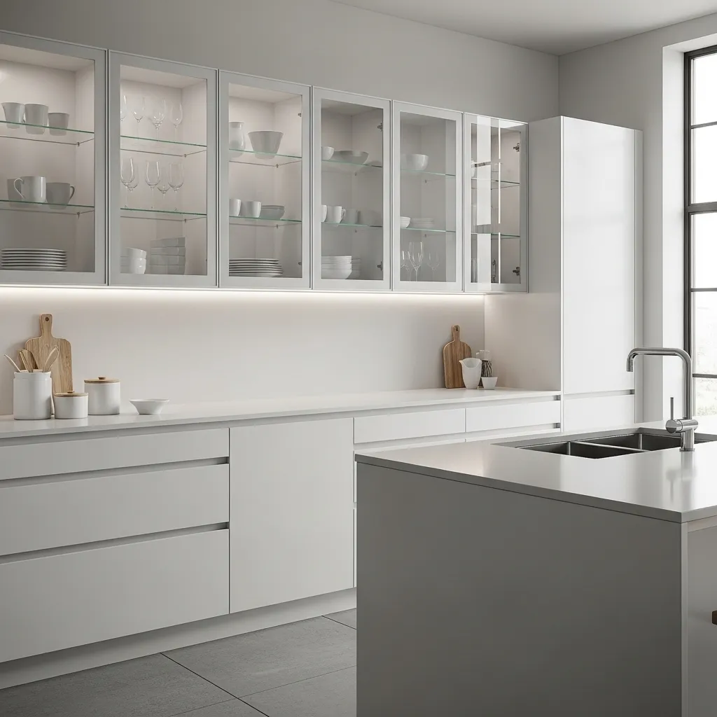 Styling Tip: Keep the items behind the glass doors neat and organized to maintain a polished look. You can opt for clear or frosted glass, depending on whether you want to show off your items or keep them partially hidden. Pair glass cabinet doors with clean, simple cabinetry for a modern, minimalist style.