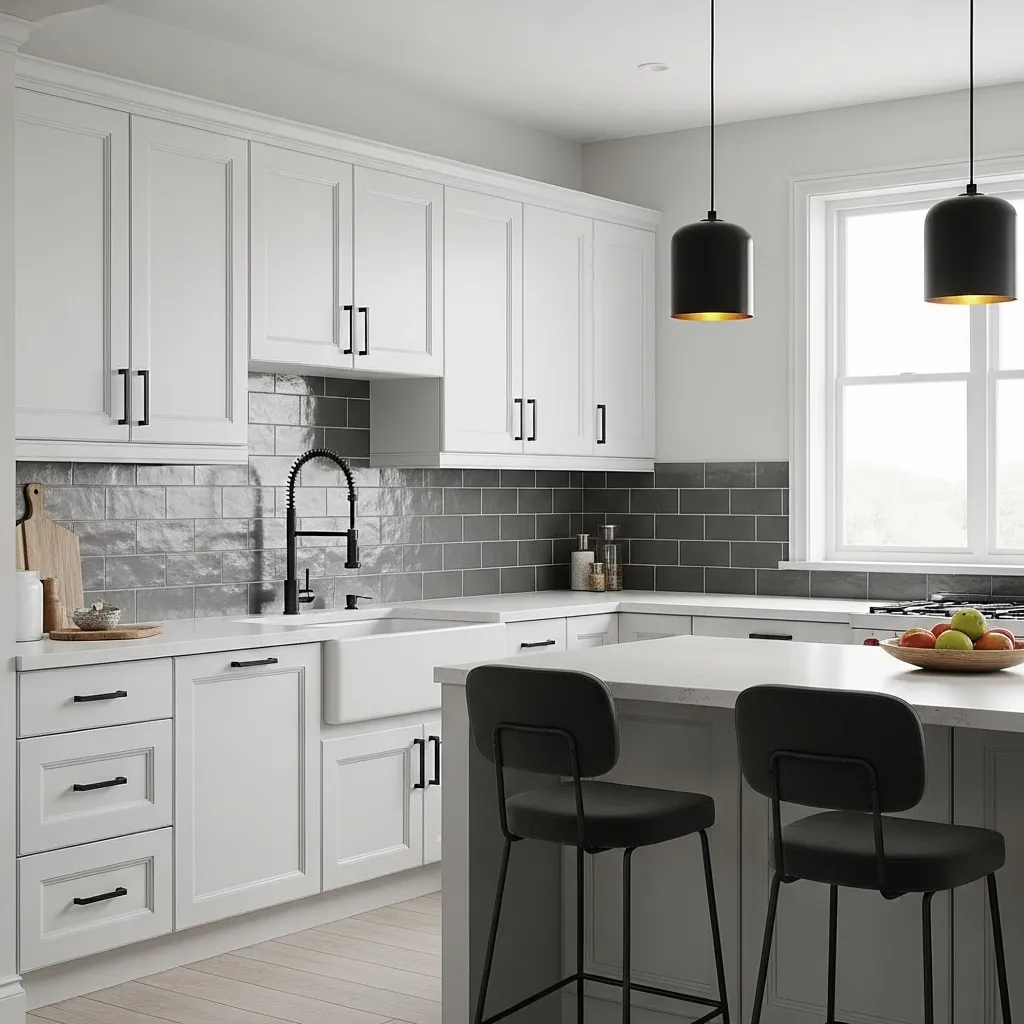 Styling Tip: Incorporate black or dark metal handles, faucets, or light fixtures for a bold yet sophisticated contrast. A deep-colored backsplash, like navy or charcoal, will provide a chic focal point while complementing the white surroundings.