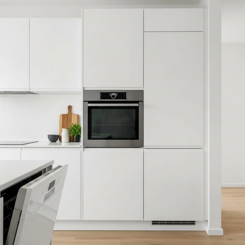 Design Tip: To maintain a sleek, uniform look in your modern white kitchen, integrate your appliances into the cabinetry. Built-in refrigerators, dishwashers, and ovens seamlessly blend into the kitchen design, allowing the focus to remain on the clean lines and beauty of the cabinetry.