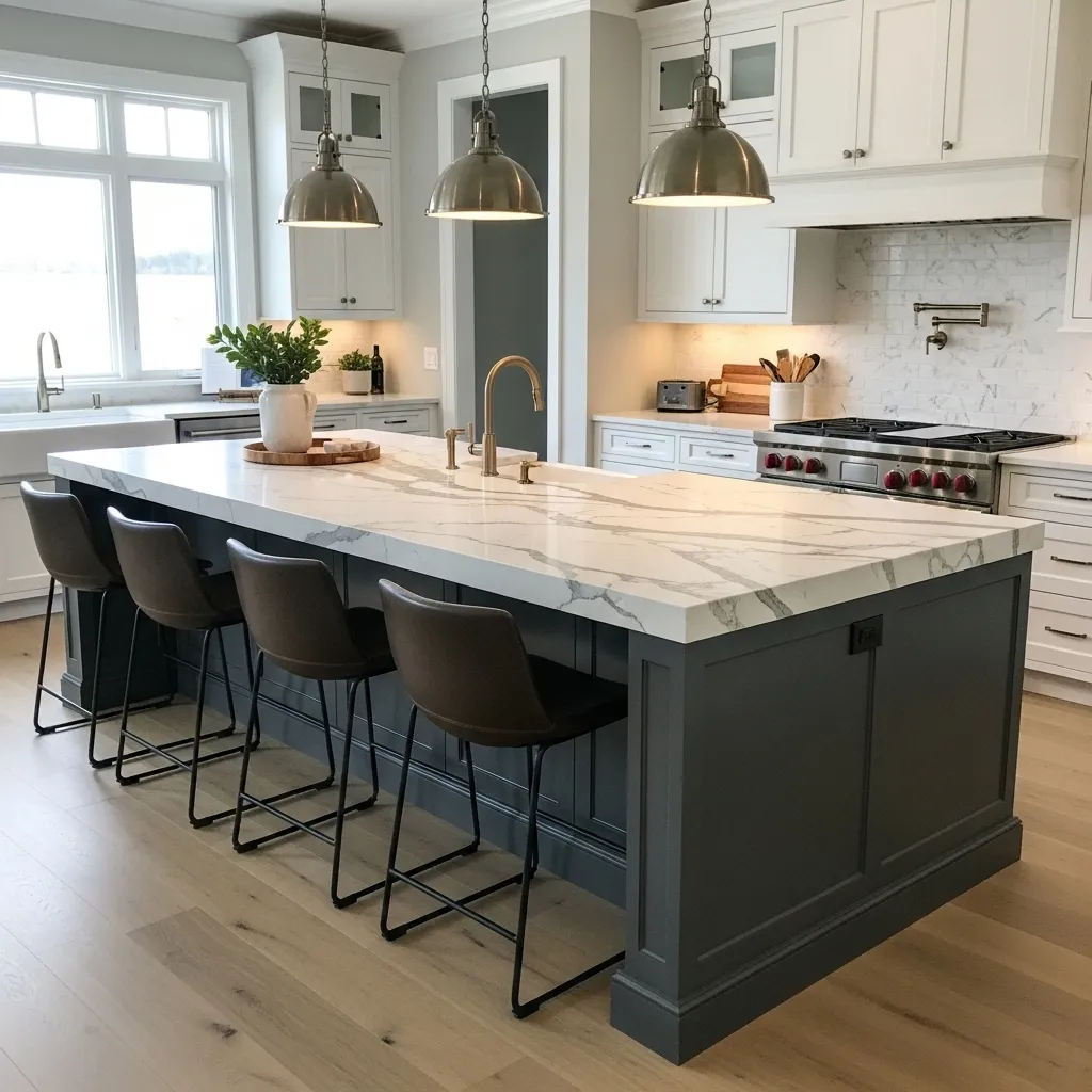 Styling Tip: To add depth and visual interest, use a different material or finish for the island’s base. For example, you could contrast a sleek white marble countertop with a matte black or wood-paneled base. Add seating to the island for a multi-functional space where family and friends can gather, eat, or chat while cooking.