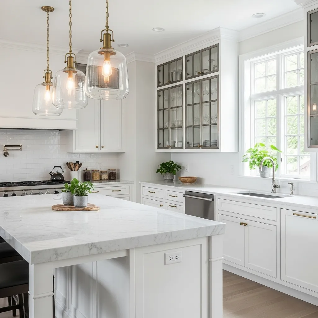 Design Tip: Incorporating glass and metal elements into a white kitchen design adds sophistication and a contemporary edge. Glass can be used for light fixtures, cabinetry fronts, or even shelving, while metal elements like stainless steel or brushed brass can be introduced through hardware, light fixtures, and accessories. These materials create a sleek, modern contrast against the clean white surfaces.