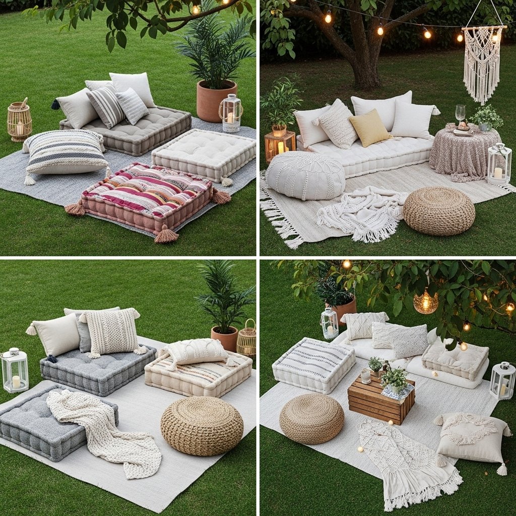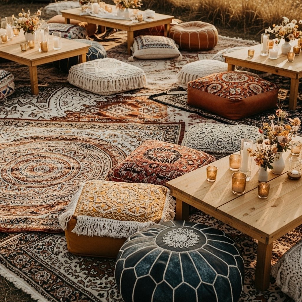 Low-seating picnic-style setups are incredibly trendy for outdoor celebrations. Layer patterned rugs and scatter cushions in earthy tones for a cozy, laid-back vibe.