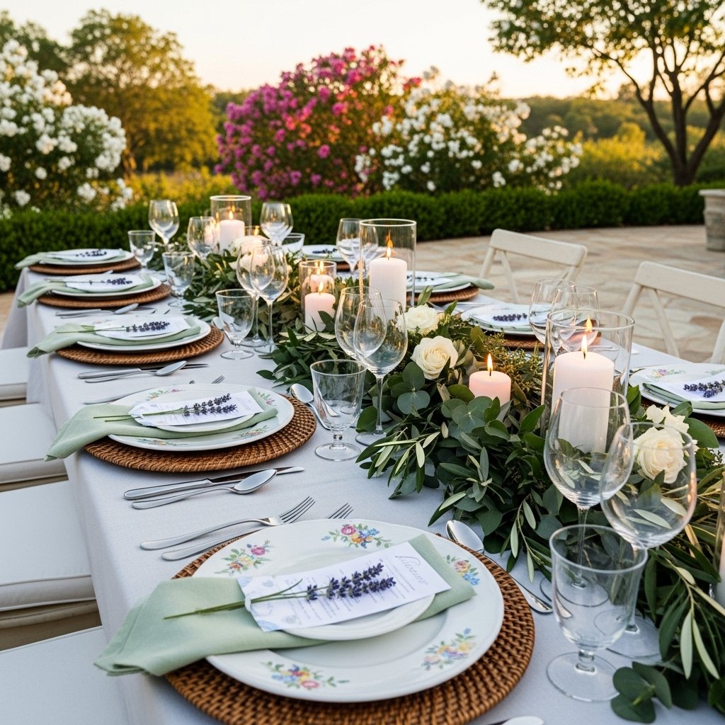 Nothing says outdoor elegance like fresh greenery woven into your table décor. Run garlands of eucalyptus, ivy, or ferns down the center of your tables, accented with tea lights or bud vases.