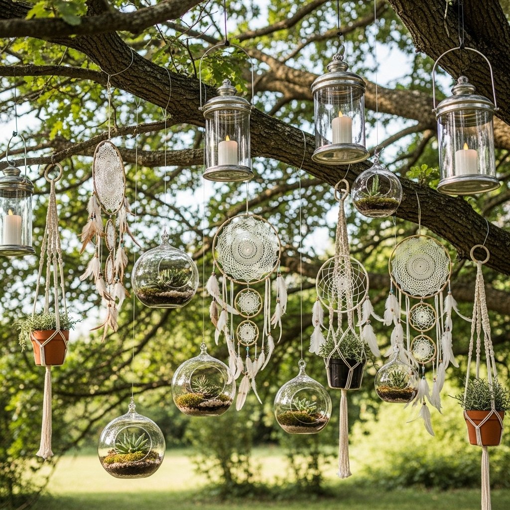 If your venue has large trees, make the most of them by hanging decorations like lanterns, dreamcatchers, birdcages, or terrariums filled with flowers.