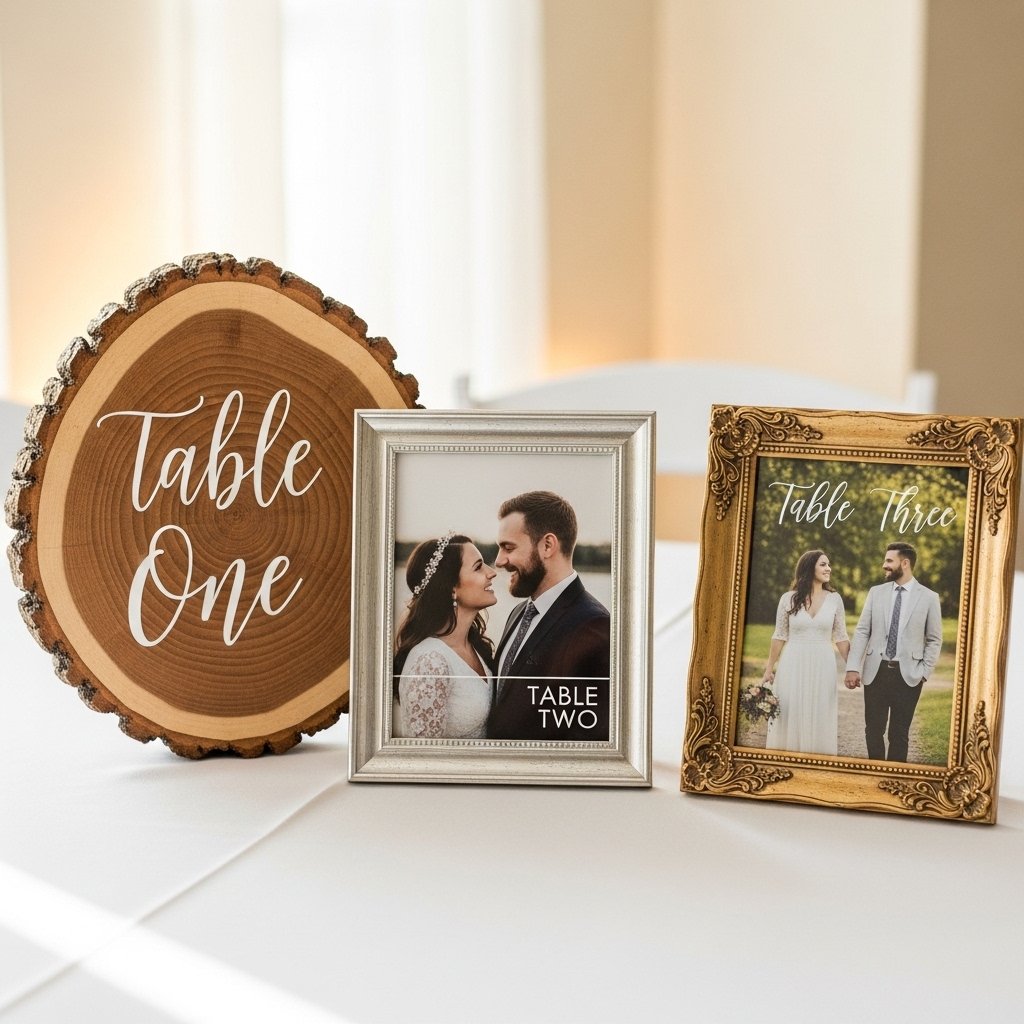 Small details make a big difference. Use personalized table numbers that match your theme — like framed pressed flowers, rustic wood slices, or painted stones.