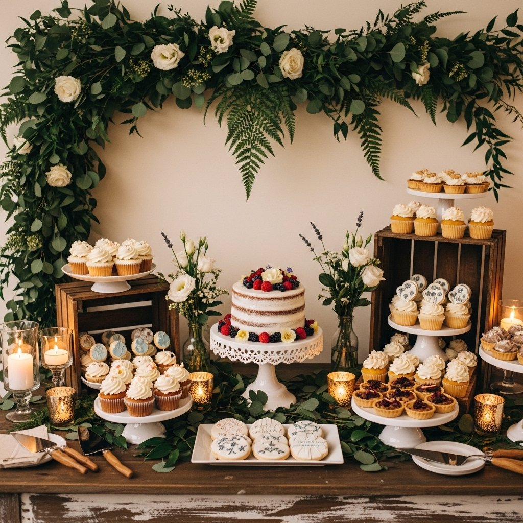 Your dessert table can double as a décor statement if styled well. Arrange cakes, cupcakes, and sweets on tiered stands, surrounded by fresh flowers, candles, or greenery.