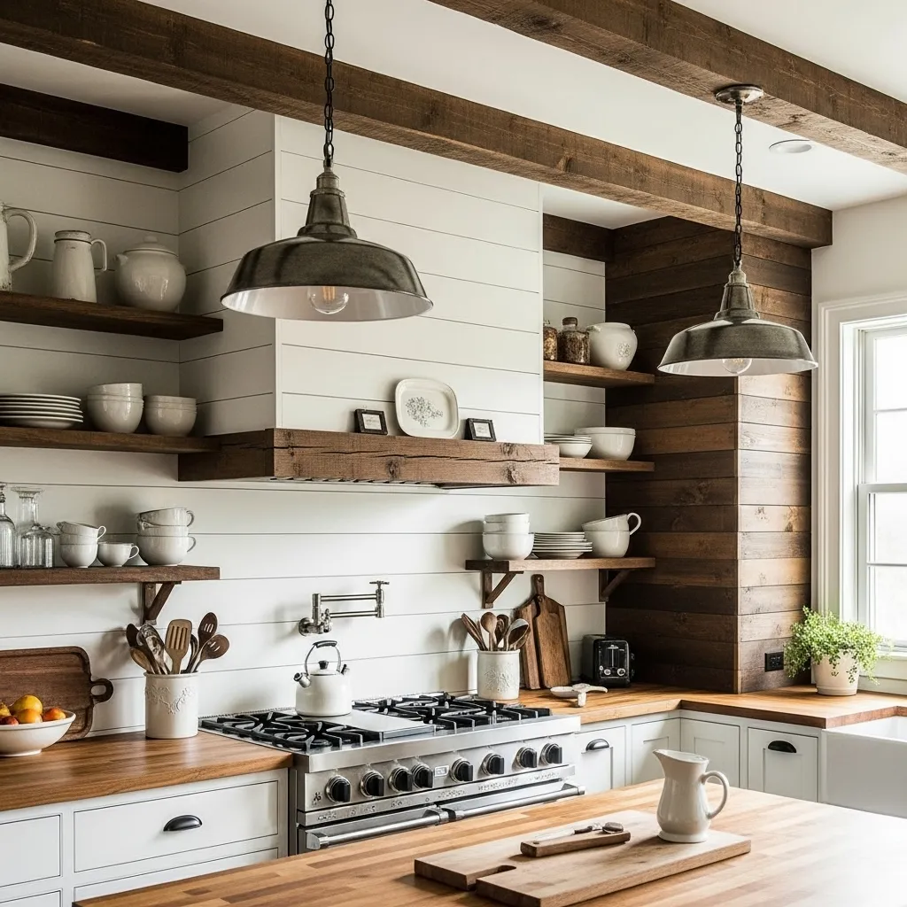 Why It Works: Shiplap is a quintessential feature of farmhouse design, adding warmth and texture to your kitchen. The horizontal wooden slats provide a rustic backdrop, making the kitchen feel like a traditional farmhouse.