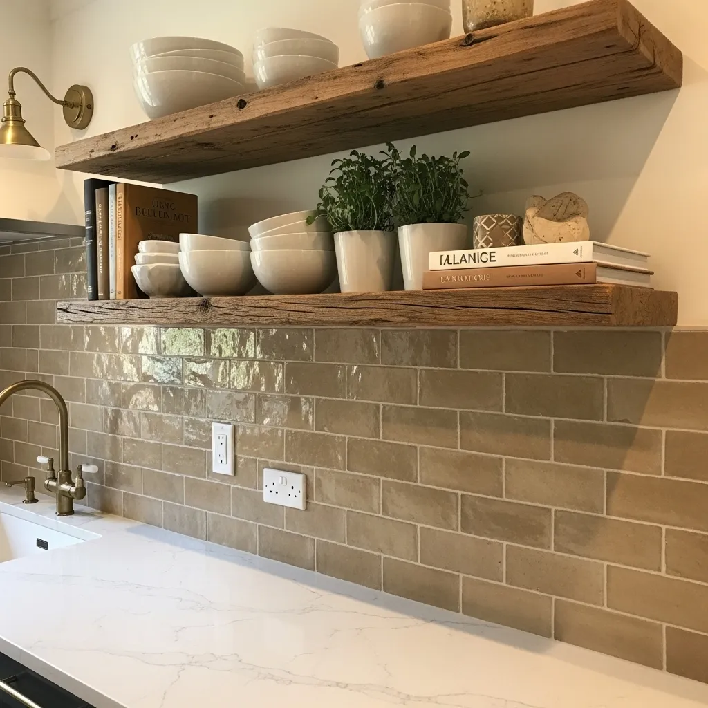 - For a warmer feel, use beige tiles and combine them with natural wood accents like open shelving or wooden countertops.