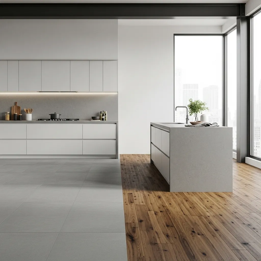 Design Tip: For a modern, industrial look, combine porcelain tiles with hardwood. Porcelain tiles, with their versatile designs and durability, pair well with wood flooring, especially in kitchens that have an open concept or are designed with a minimalist style.