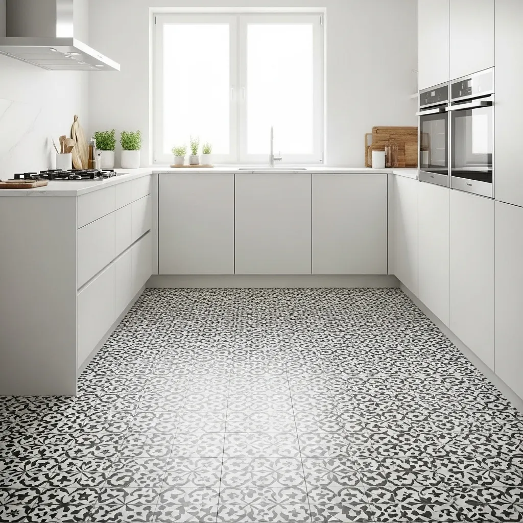 Why It Works: Patterned vinyl can be a fun way to express your style while still enjoying the durability and ease of vinyl flooring. It can also serve as a focal point in an otherwise neutral kitchen design, creating a visually interesting contrast with white or minimalist cabinets.