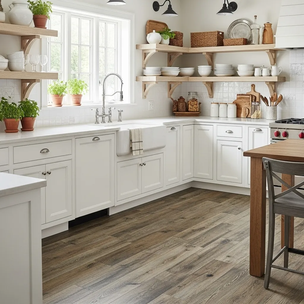 Styling Tip: Pair this flooring with white or cream-colored cabinets and natural wood accents. To complete the farmhouse look, incorporate open shelving, rustic lighting, and vintage accessories for a warm, inviting space.