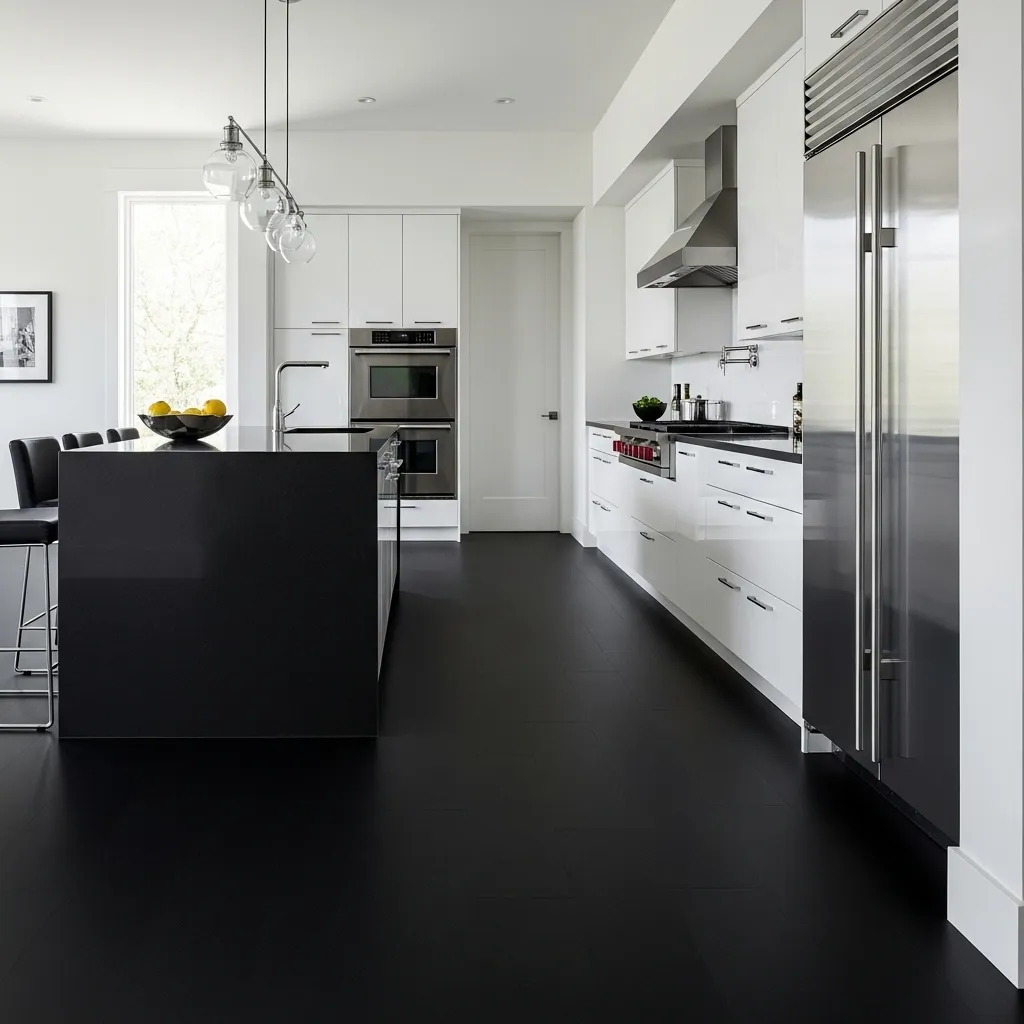 Styling Tip: Complement dark vinyl flooring with sleek, high-gloss finishes for cabinetry, stainless steel appliances, and minimalistic hardware. This creates a chic, polished look while maintaining an open and spacious feel.