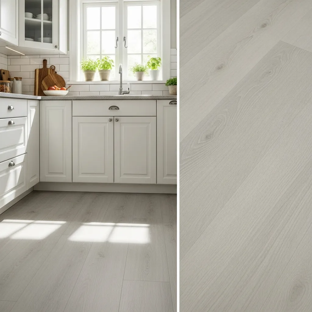 Why It Works: Light vinyl floors reflect light, helping to brighten up the space. Paired with white cabinets, this combination creates a cohesive and spacious atmosphere. Light vinyl is also a versatile base for various design styles, from modern to coastal.
