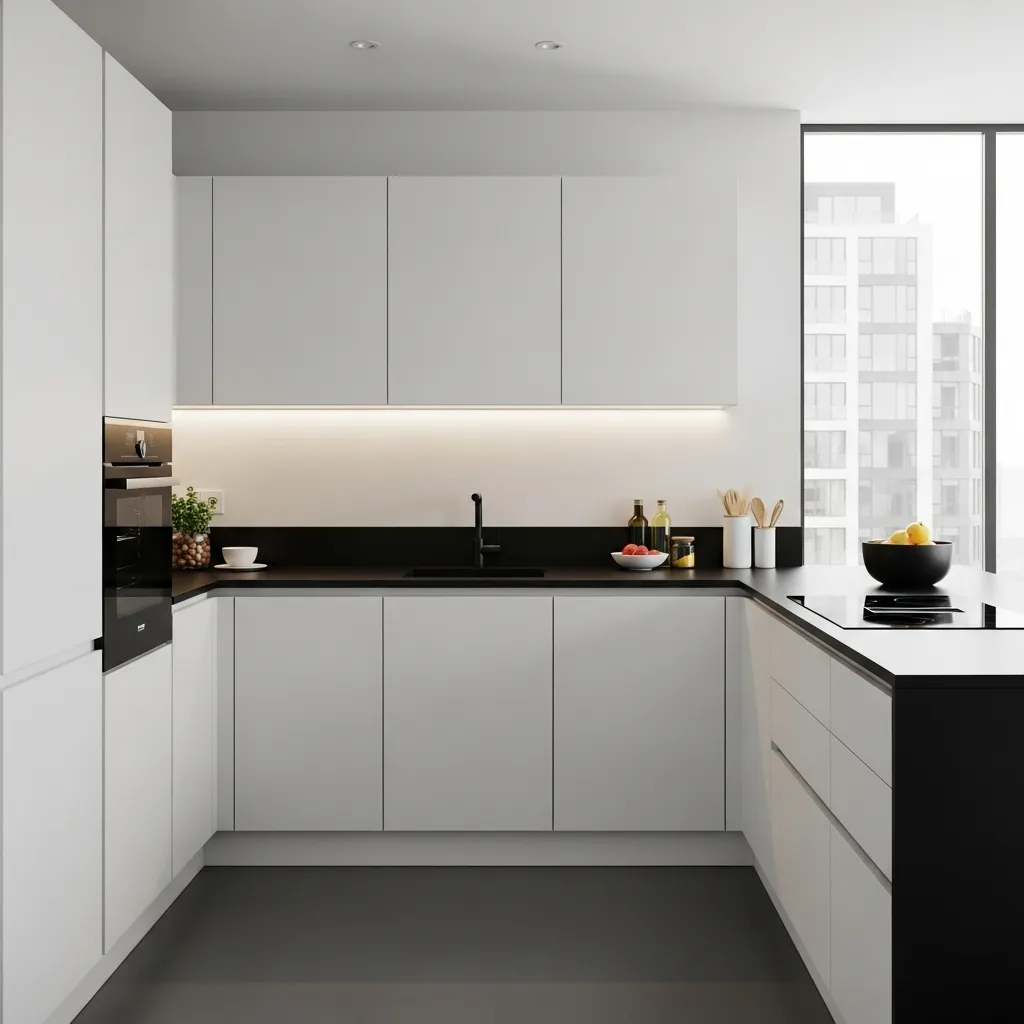 A modern minimalist kitchen focuses on clean lines and simplicity. Using flat-panel white cabinets paired with matte black countertops creates a sleek and uncluttered look. The strong contrast makes the space feel sharp, stylish, and very contemporary.