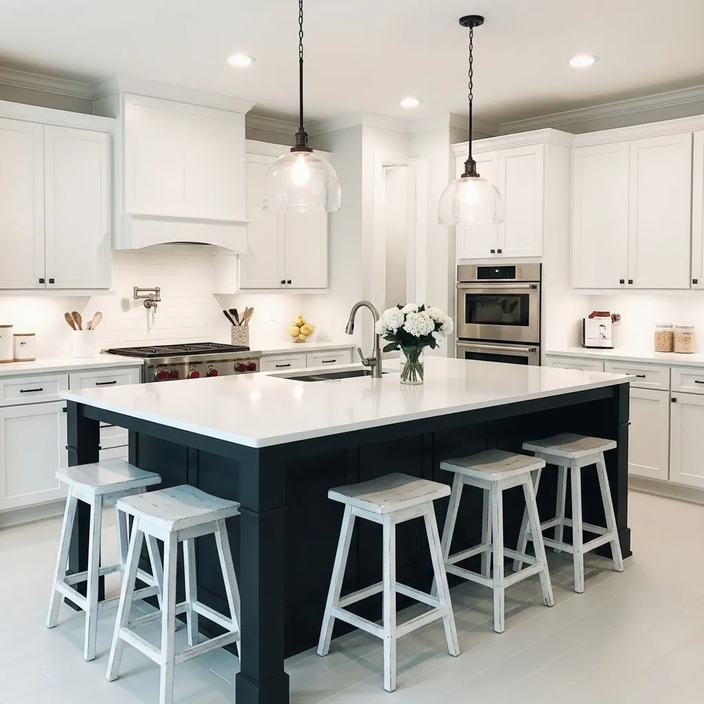 Create visual interest by designing a two-tone kitchen island. Keep the main cabinets white, but choose a black or dark island to match the countertops. This creates a focal point and adds depth to the kitchen design.