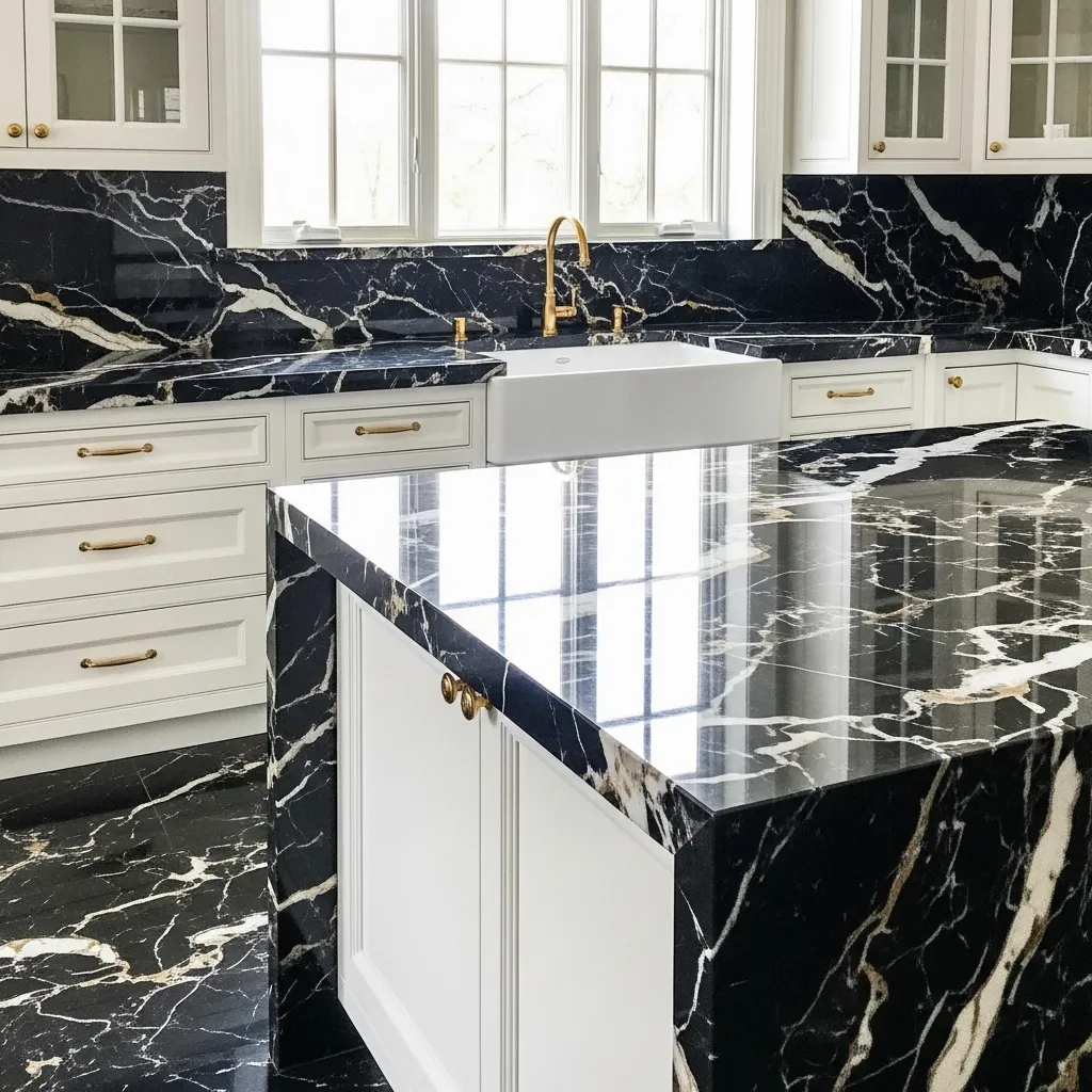 Black marble countertops bring elegance and luxury to white cabinets. The natural veining in marble adds movement and character, making the kitchen feel more sophisticated. Pairing marble with white cabinetry gives the space a high-end, timeless look.