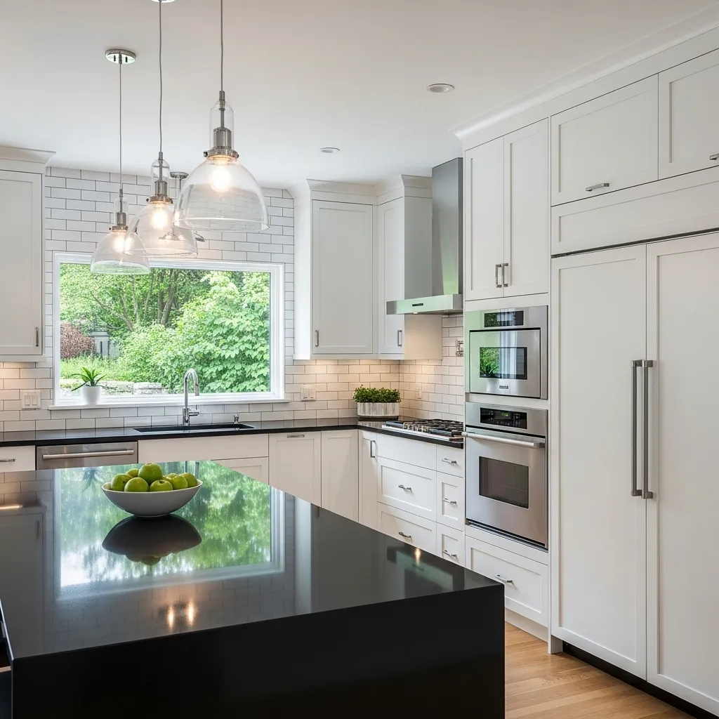The classic combination of black countertops and white cabinets creates a bold yet balanced look in any kitchen. This contrast brings together brightness and depth, making the space feel both modern and timeless.