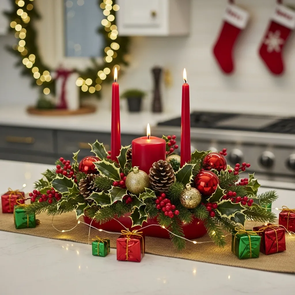 Styling Tip: For a dramatic effect, place the centerpiece in the center of the island and add small decorative items around it, such as tiny gift boxes, cinnamon sticks, or dried oranges, for extra festive flair.