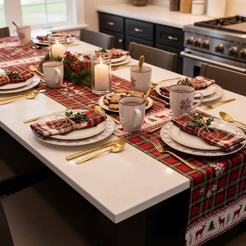 Design Tip: Add a holiday-themed table runner along the length of your kitchen island, paired with matching place settings. Choose a runner with festive patterns like snowflakes, reindeer, or holly, and complement it with plates, napkins, and flatware that feature holiday designs.