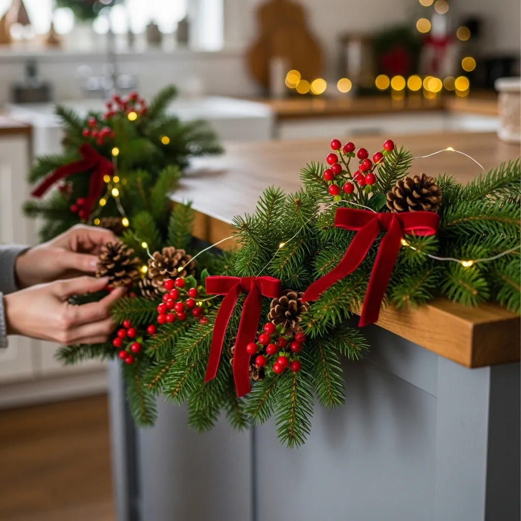 Why It Works: Garland brings a natural, fresh feel to your kitchen island and can be easily customized to match your color scheme or holiday style. The rich greenery adds texture, while the lights or ribbons provide sparkle.