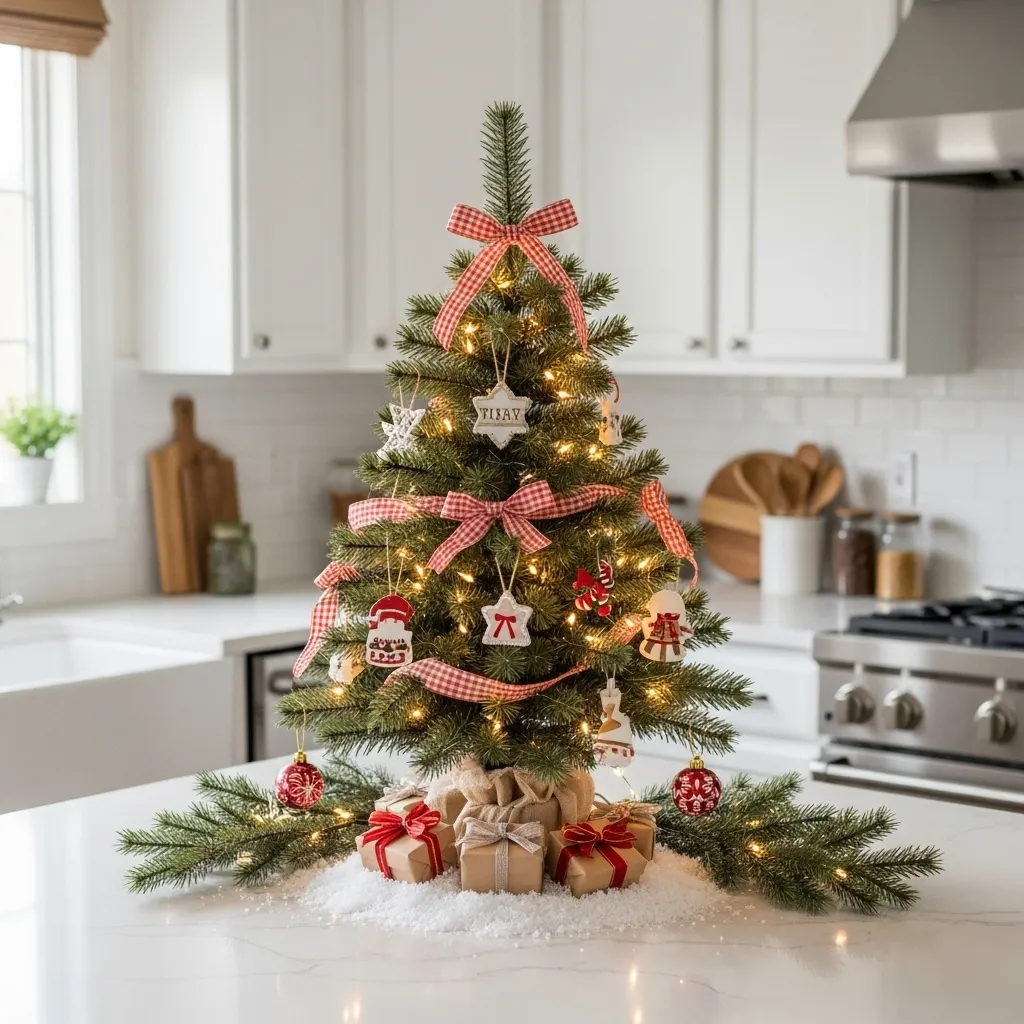 Why It Works: A mini Christmas tree adds an adorable and festive touch to your kitchen island. It’s perfect for those who love the traditional look of a Christmas tree but don’t have room for a full-sized one.