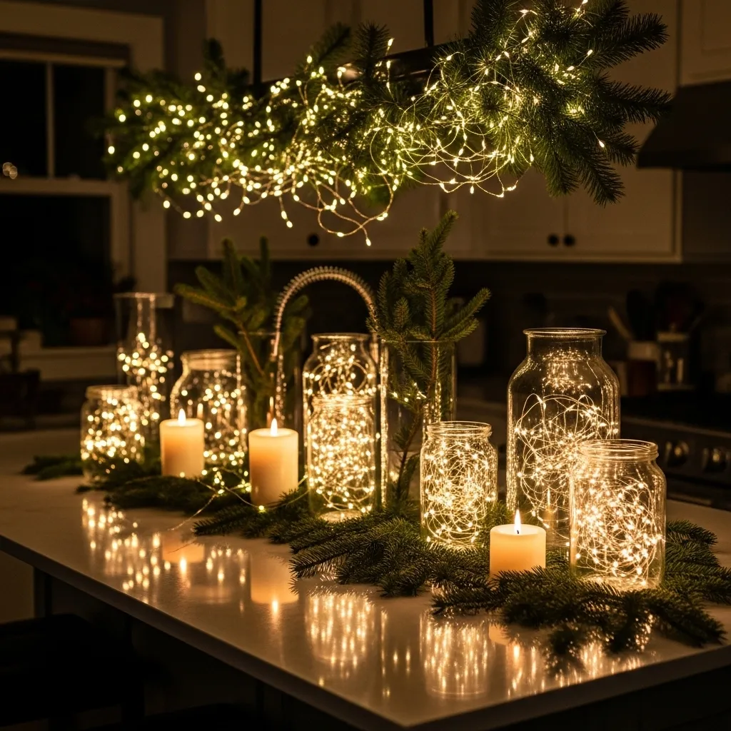 Why It Works: Fairy lights bring an instant holiday magic to any space. The soft glow adds warmth and coziness, making your kitchen feel inviting and festive. They’re perfect for evening meals or when you’re entertaining guests.