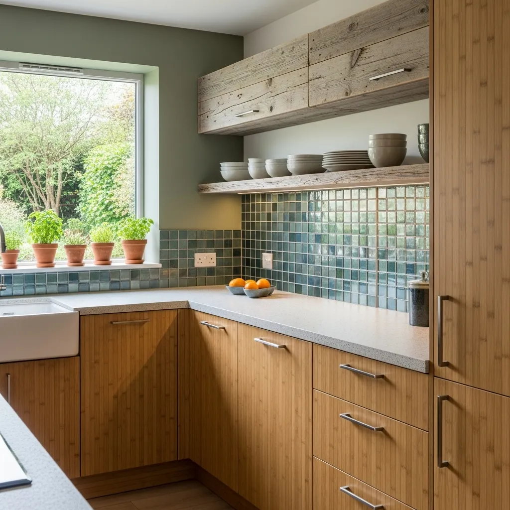 - Choose bamboo cabinets or recycled glass tiles for your backsplash.
