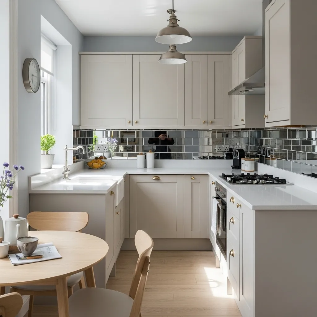 Why It Works: Mirrors or reflective surfaces can make a small kitchen feel larger by reflecting light and creating the illusion of more space. Glossy finishes, glass tiles, or even mirrored backsplashes can help brighten up your kitchen.