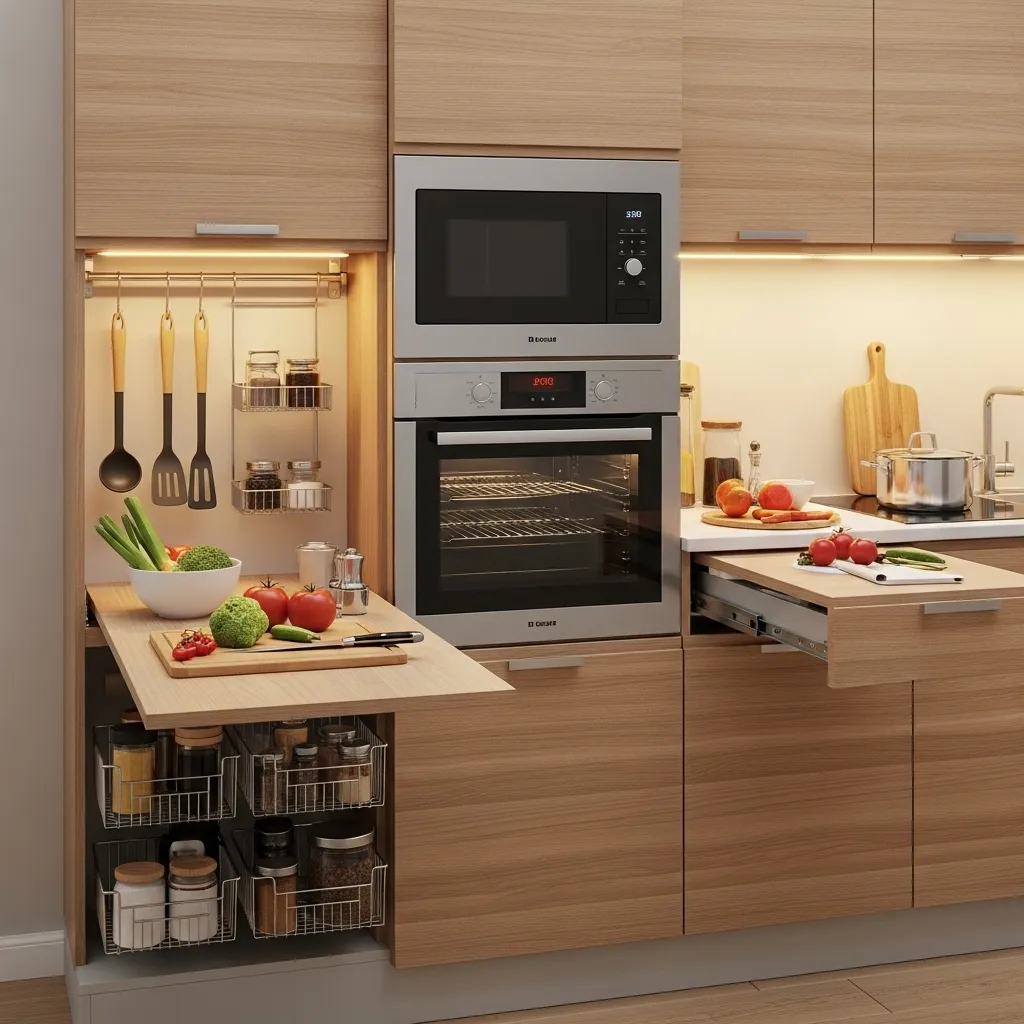 Why It Works: Multi-functional items keep the kitchen organized and efficient, reducing the need for bulky furniture or appliances in small spaces.