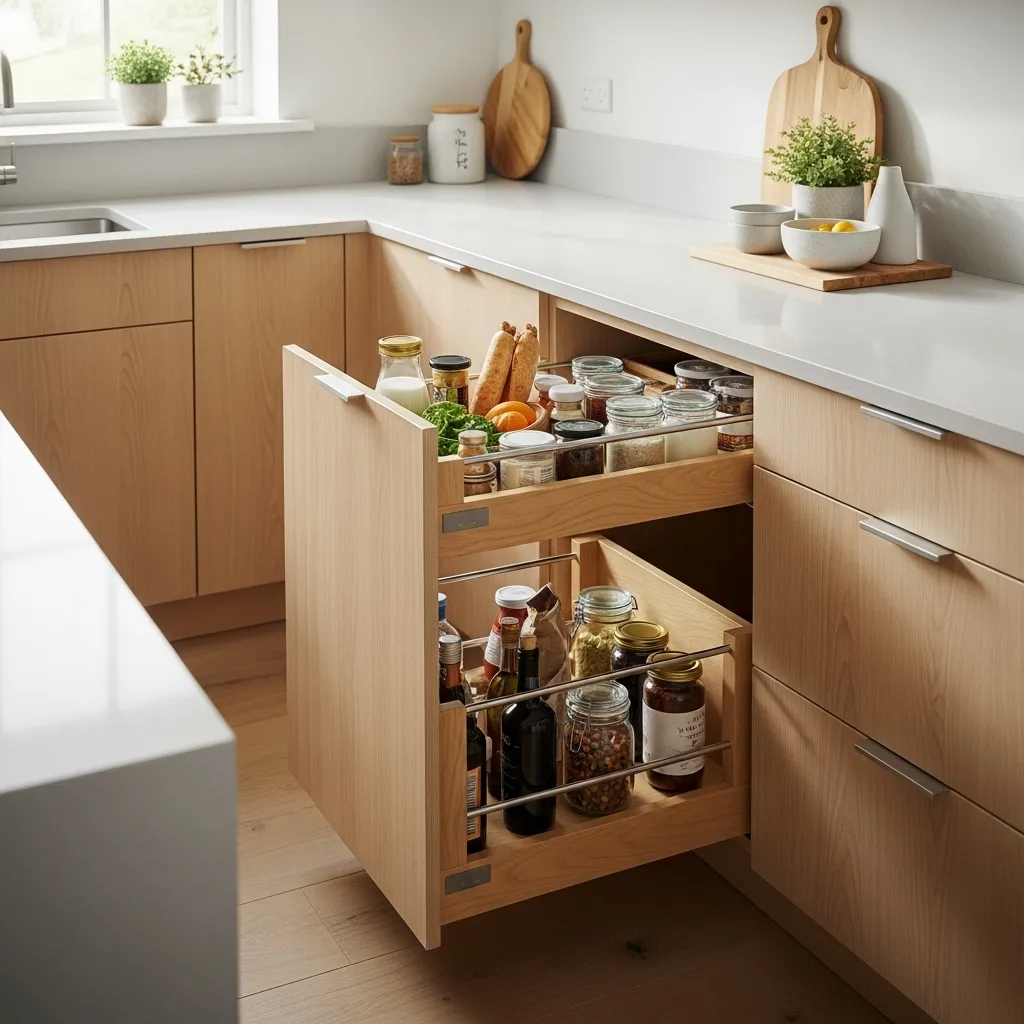 - Install pull-out pantry shelves or spice racks to organize dry goods and condiments.