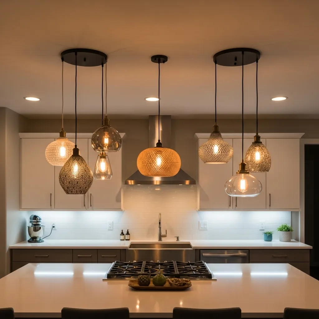 - Use pendant lights above the island stove for focused lighting.