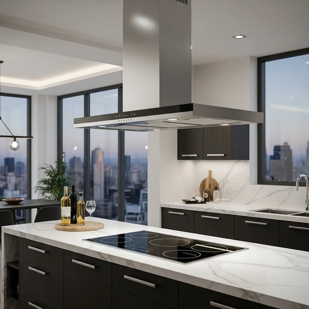 - Choose a sleek, modern range hood in materials like stainless steel, glass, or matte black for a clean look.