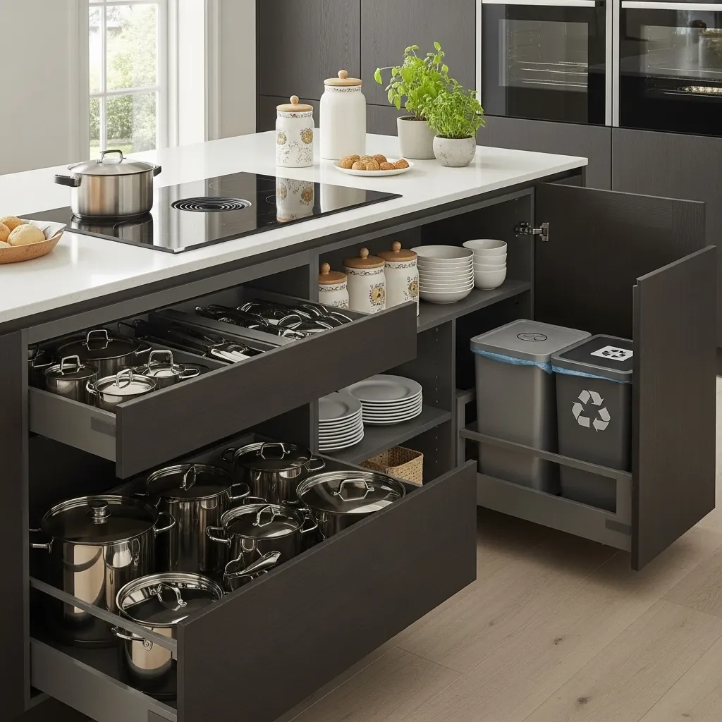 - If space allows, add pull-out trash bins or recycling drawers to keep the kitchen tidy.