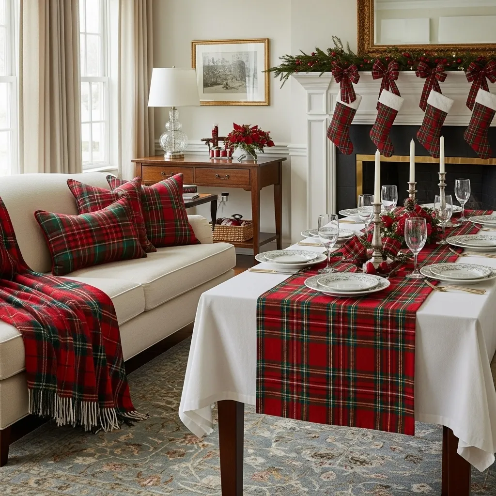 Styling Tip: For a cohesive look, use plaid in multiple areas of the room—on your mantelpiece, in a wreath, or even as an accent in your dining setup. Don’t overdo it; balance it with solid-colored textiles to prevent the decor from feeling too overwhelming.