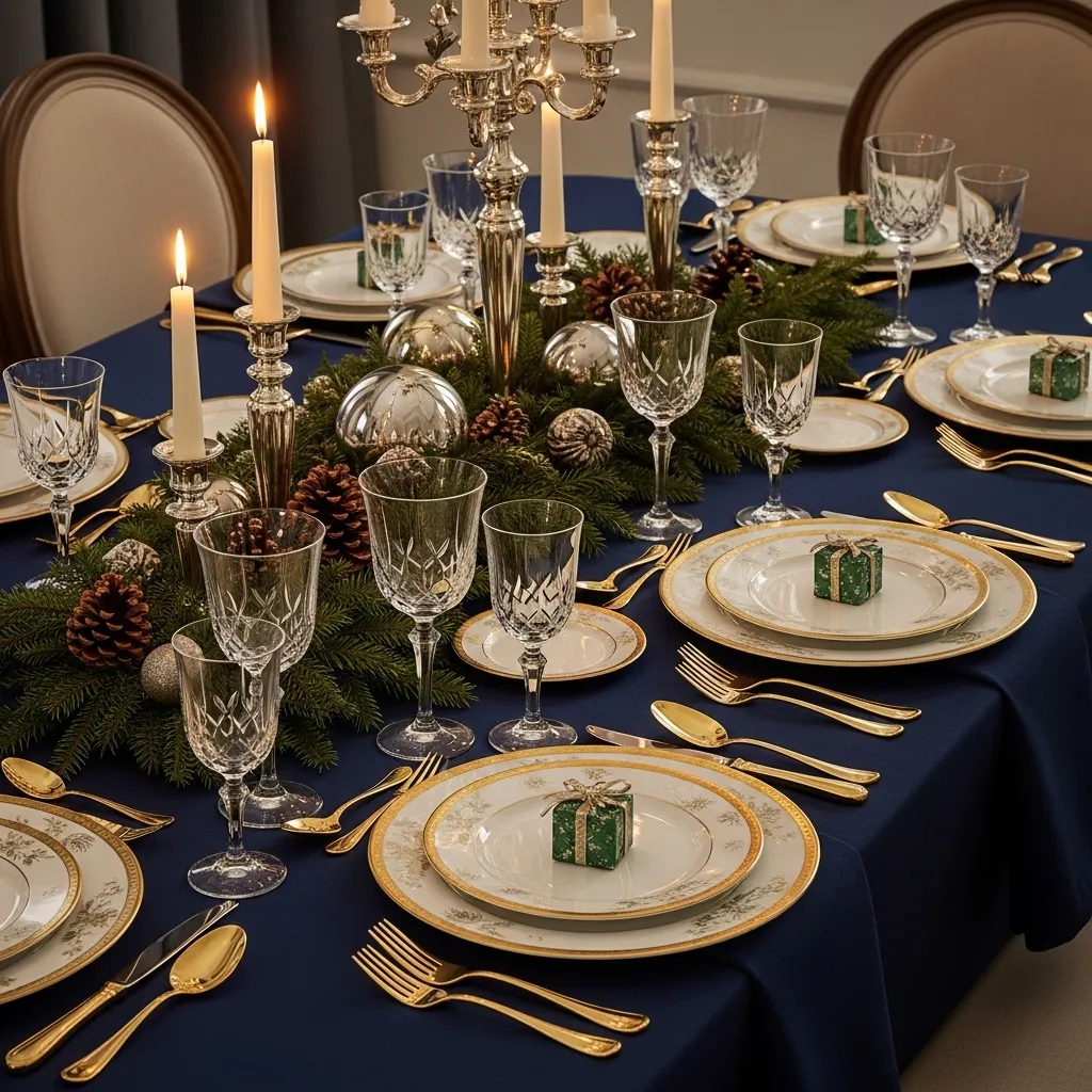 Styling Tip: Set the table with tall, elegant candlesticks to add height and sophistication. Arrange your plates symmetrically and add some natural elements, like evergreen sprigs, for a fresh holiday touch.