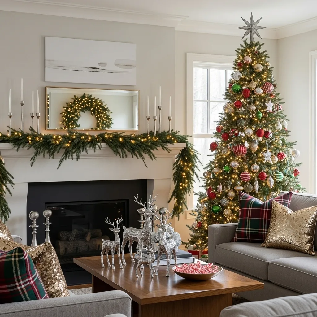 Styling Tip: To balance traditional and modern decor, opt for classic colors like red and green and combine them with metallic accents like silver or gold. A contemporary statement piece, such as a modern, sleek tree topper, can add a modern twist to the traditional setup.