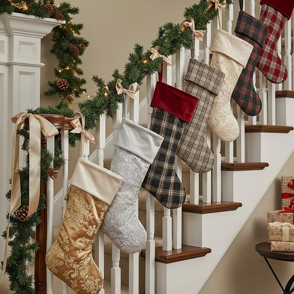 Styling Tip: For a cohesive look, ensure each stocking matches the overall theme of your decor, whether it’s traditional plaid, elegant metallics, or rustic textures. Use satin ribbon ties to hang them for a polished finish.