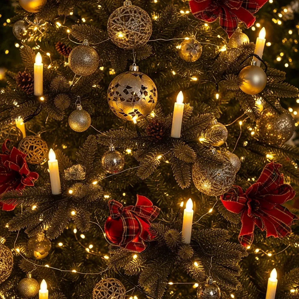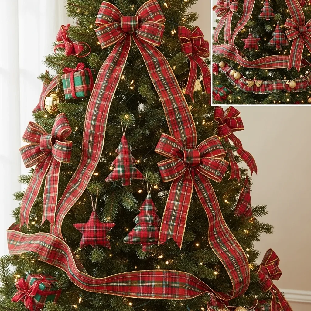 - Drape plaid ribbons (such as red and green tartan) across the branches, making sure they cascade in a flowing, natural way.