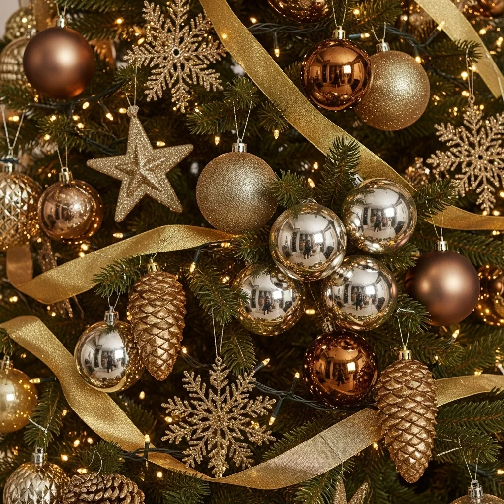 Why It Works: Metallics add a refined, luxurious touch that elevates the entire look of your tree while maintaining the festive spirit. They create visual interest and reflect the light beautifully.