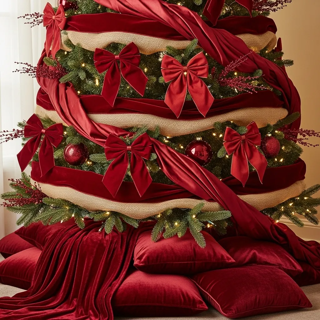 - Drape plush velvet throws or satin pillows underneath the tree to tie everything together.