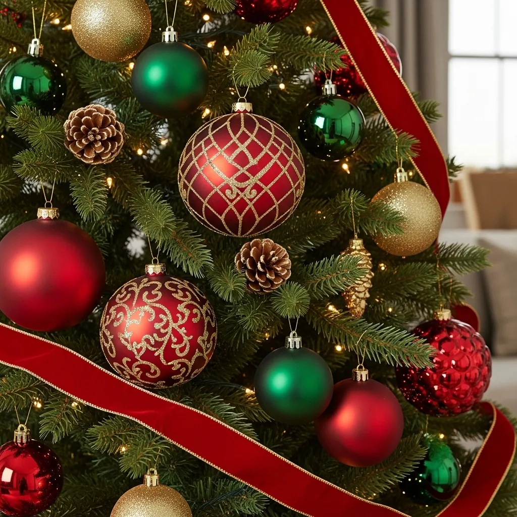 - Use deep red ornaments, forest green garlands, and gold baubles to create a rich, harmonious look.