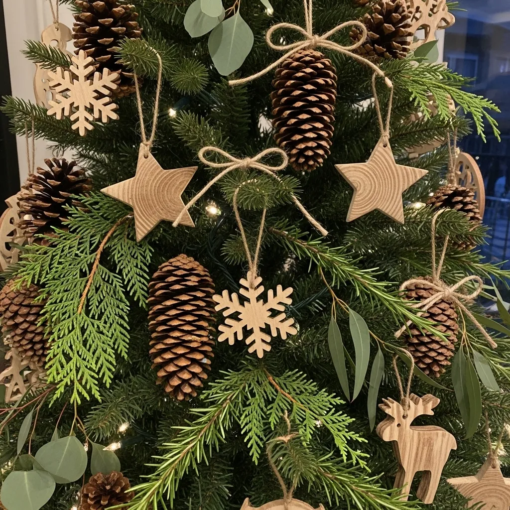 - Scatter pinecones throughout the tree, or use wooden ornaments or branches to give the tree texture.