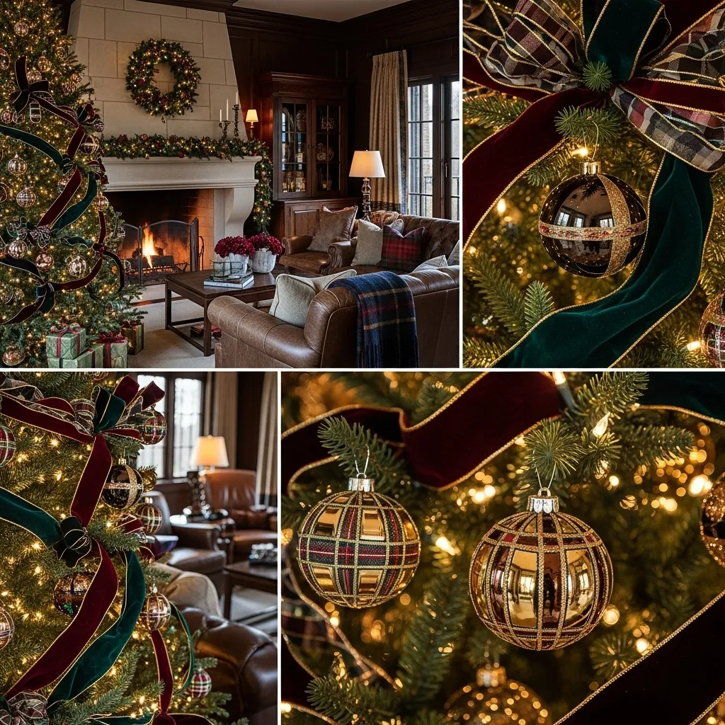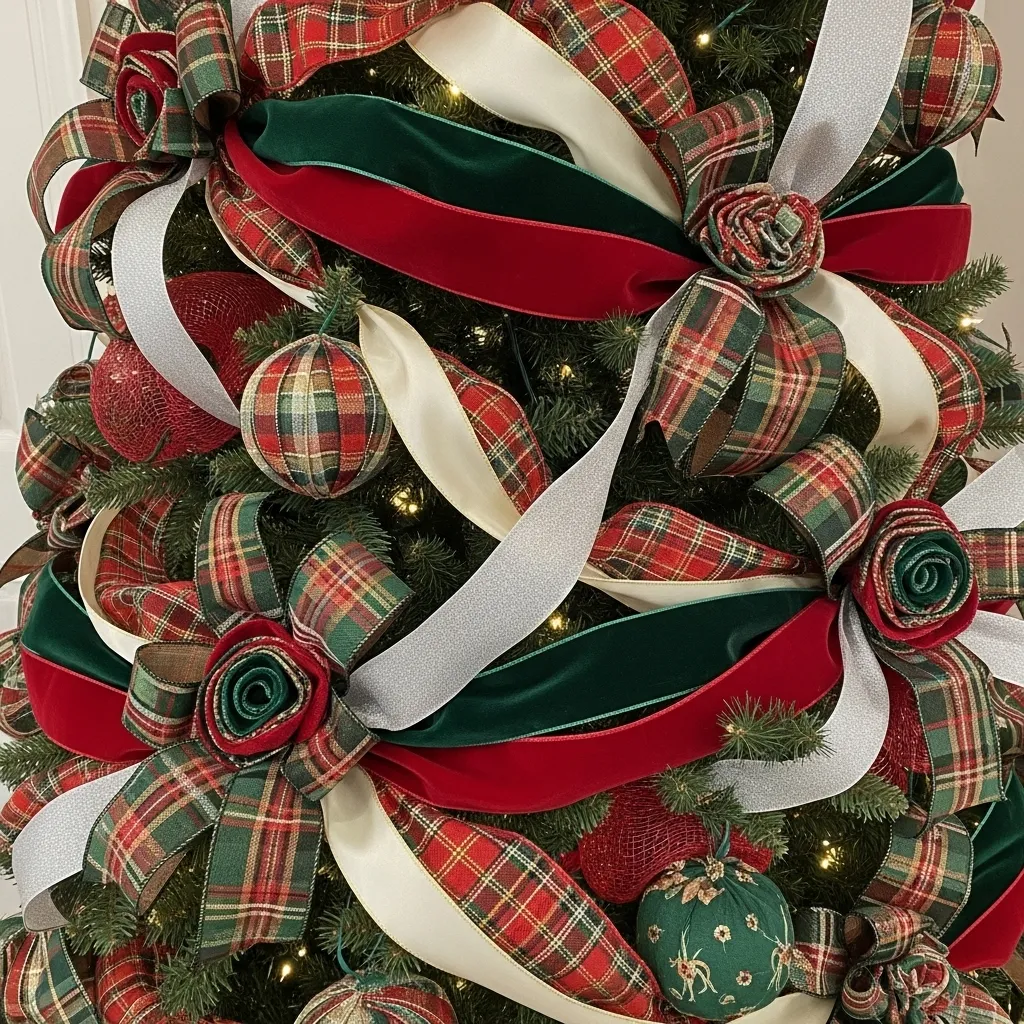 - Use plaid ribbons in shades of red, green, and gold to create depth and dimension on the tree.